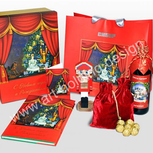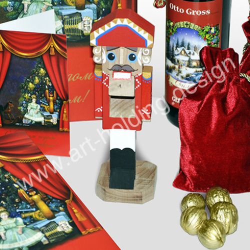 200-летний юбилей всеми любимой сказки Гофмана "Щелкунчик" в наступающем Новом Году послужили вдохновением в создании подарочного набора для компании "Сибур". В состав набора вошли: настоящий деревянный Щелкунчик, который исправно щелкает орешки, шоколадные трюфели и орешки с пожеланиями в бархатных мешочках, подарочное издание книги Гофмана "Щелкунчик" в дизайнерском шубере, глинтвейн в праздничном декоре, а также открытка, дизайнерская коробка и подарочный пакет в стиле концепции.