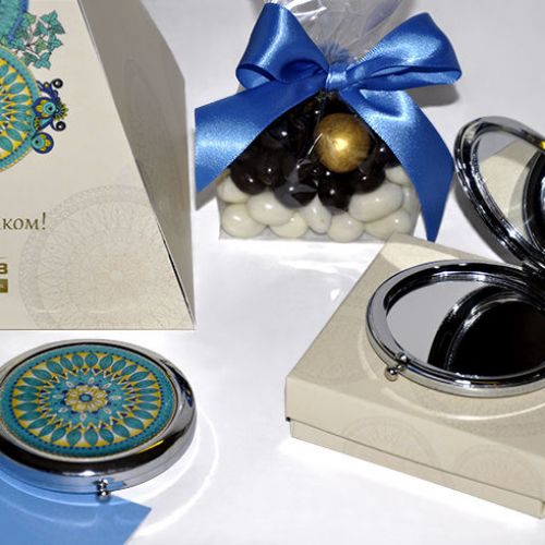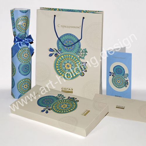 Специально для компании "СОГАЗ" дизайнерская группа "Арт-Холдинг" разработала подарочный набор к Международному женскому дню. Все компоненты набора выполнены в едином стиле. Шелковый платок с индивидуальным дизайном выполнен в фирменных цветовых сочетаниях компании.