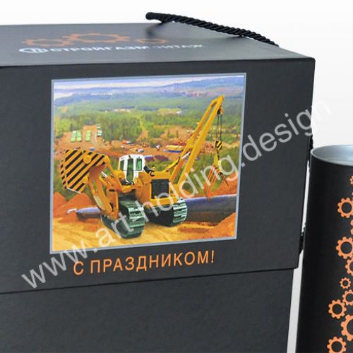 Специально для компании "Стройгазмонтаж" креативная группа "Арт-Холдинг" представила подарочный набор "С праздником!" ко дню нефтяника. В подарочный набор вошли: элитный алкоголь в дизайнерском тубусе, светящийся бокал (свечение стекла от прикосновения руки), сифон для приготовления газированных напитков, сироп со вкусом апельсина, коробка с дизайном в стиле картины, нарисованной маслом "Трубоукладчик Стройгазмонтаж" и подарочная открытка в стиле концепции.