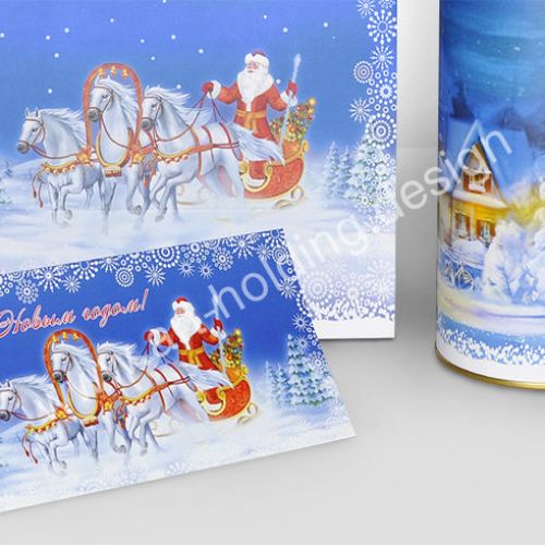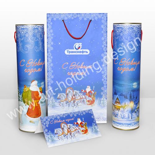 Подарочный пакет и декоративные тубусы под спиртное и конфеты из дизайнерского картона, разработанные креативной группой "Арт-Холдинг" для оформления подарочного набора к Новому Году для компании "Транснефть", выполнены в ярком иллюстрированном стиле. Изображение главного героя праздника Деда Мороза и поздравительные надписи "С Новым Годом!" в сочетании с логотипом на пакете, тубусах и открытке подчеркивают праздничную тематику, заряжают новогодним настроением и создают волшебную атмосферу зимней сказки.